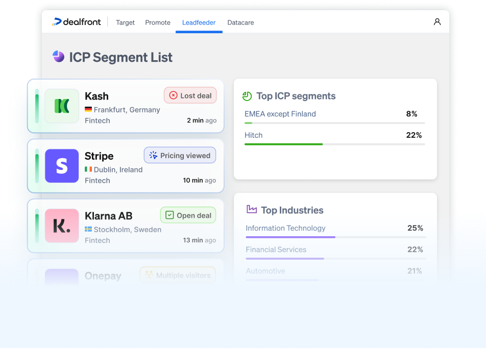 Know exactly when ICP-fit accounts visit your site, access auto-generated lead lists by segment, and follow up faster with high-intent prospects that match your ideal customer.