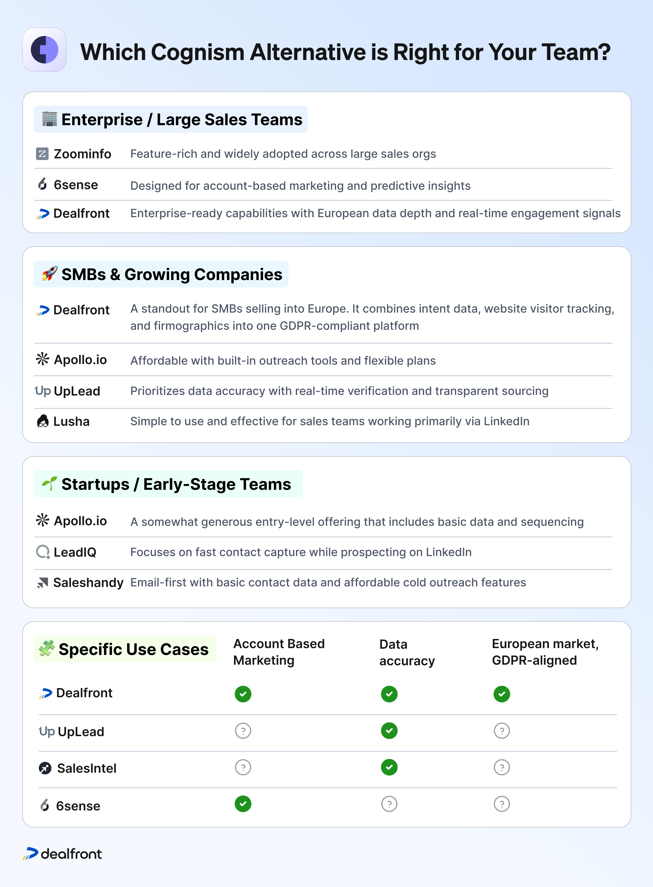 For larger or enterprise teams with larger budgets and complex needs, ZoomInfo, 6sense, or Dealfront offer robust features and extensive data coverage. If your team needs deep integrations, advanced intent data, and large-scale coverage, these platforms are built for scale: