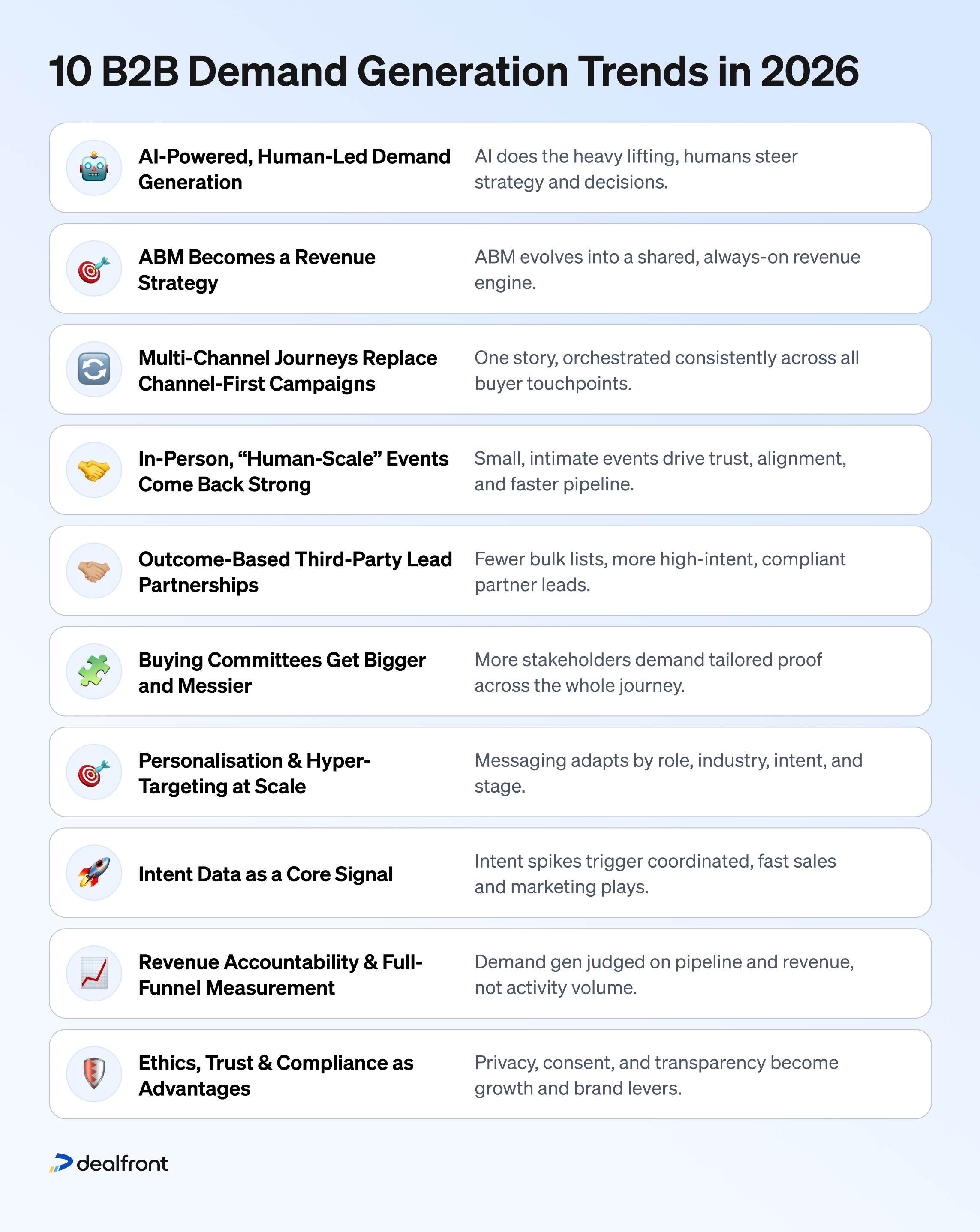 This article doesn’t simply list trends. It shows how to turn them into pipeline in 2026, with 10 essential demand gen trends, examples, playbooks, and next steps… plus a few extras, such as, how platforms like Dealfront help operationalise them across European markets.