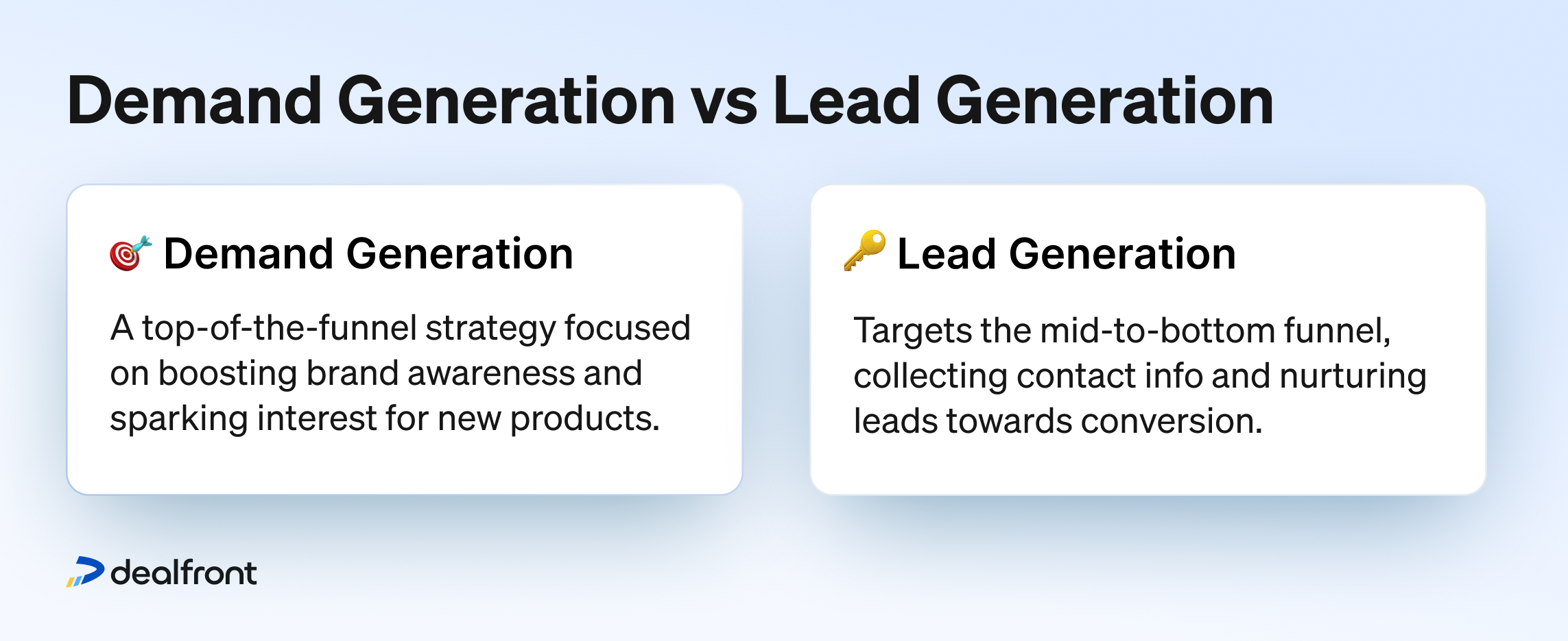 The central difference between demand generation vs lead generation comes down to what they’re trying to achieve.