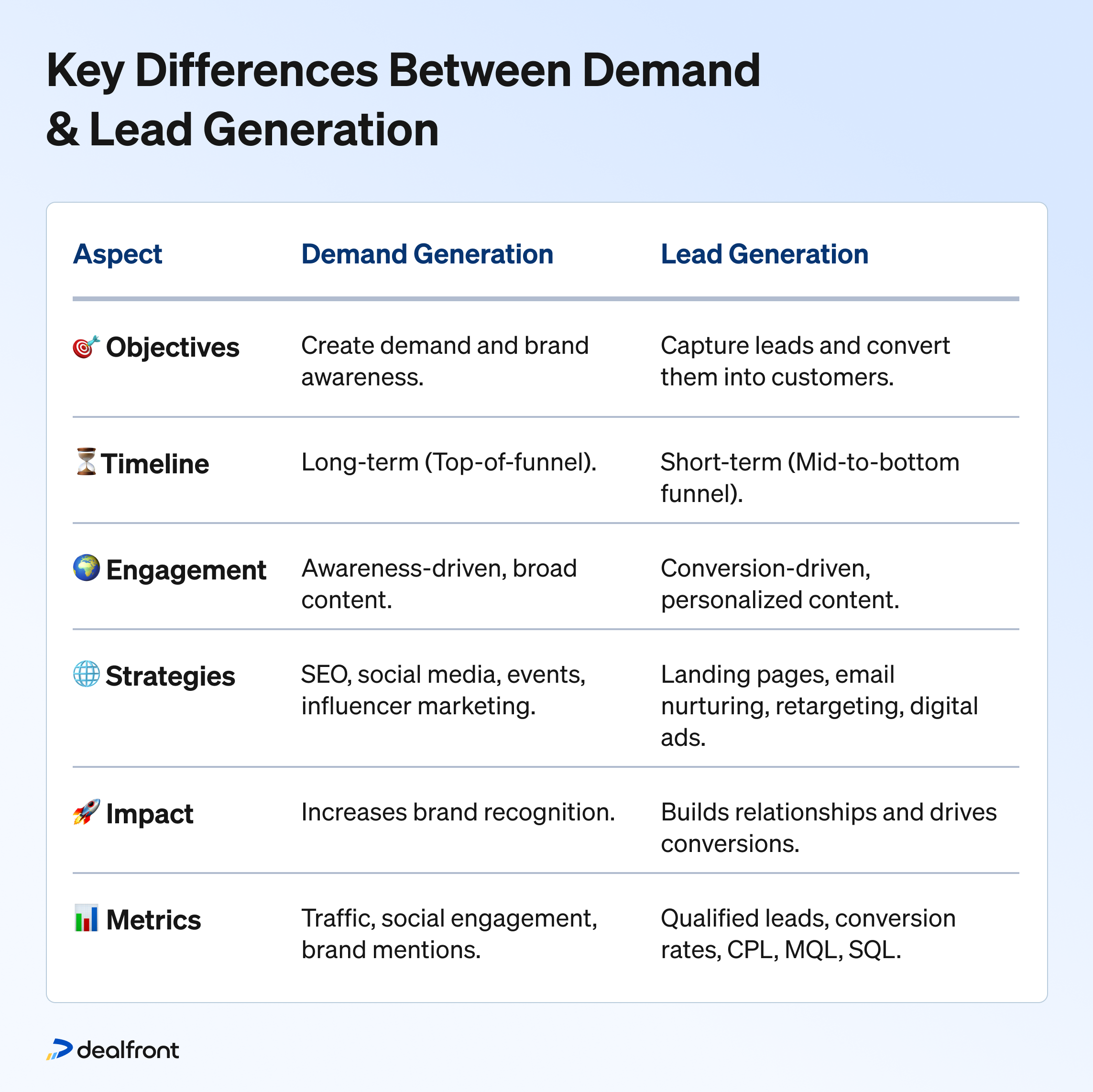 Want to see the differences between demand generation and lead generation at a glance? Here’s a table summarizing the key differences: