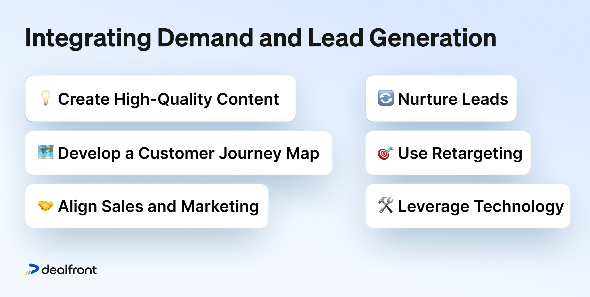 Essentially, demand generation and lead generation are interdependent. Combining the two strategies creates a cohesive path from awareness to conversion, where you can attract a wide new audience and smoothly convert them from interested prospects into qualified leads—and then into paying customers.