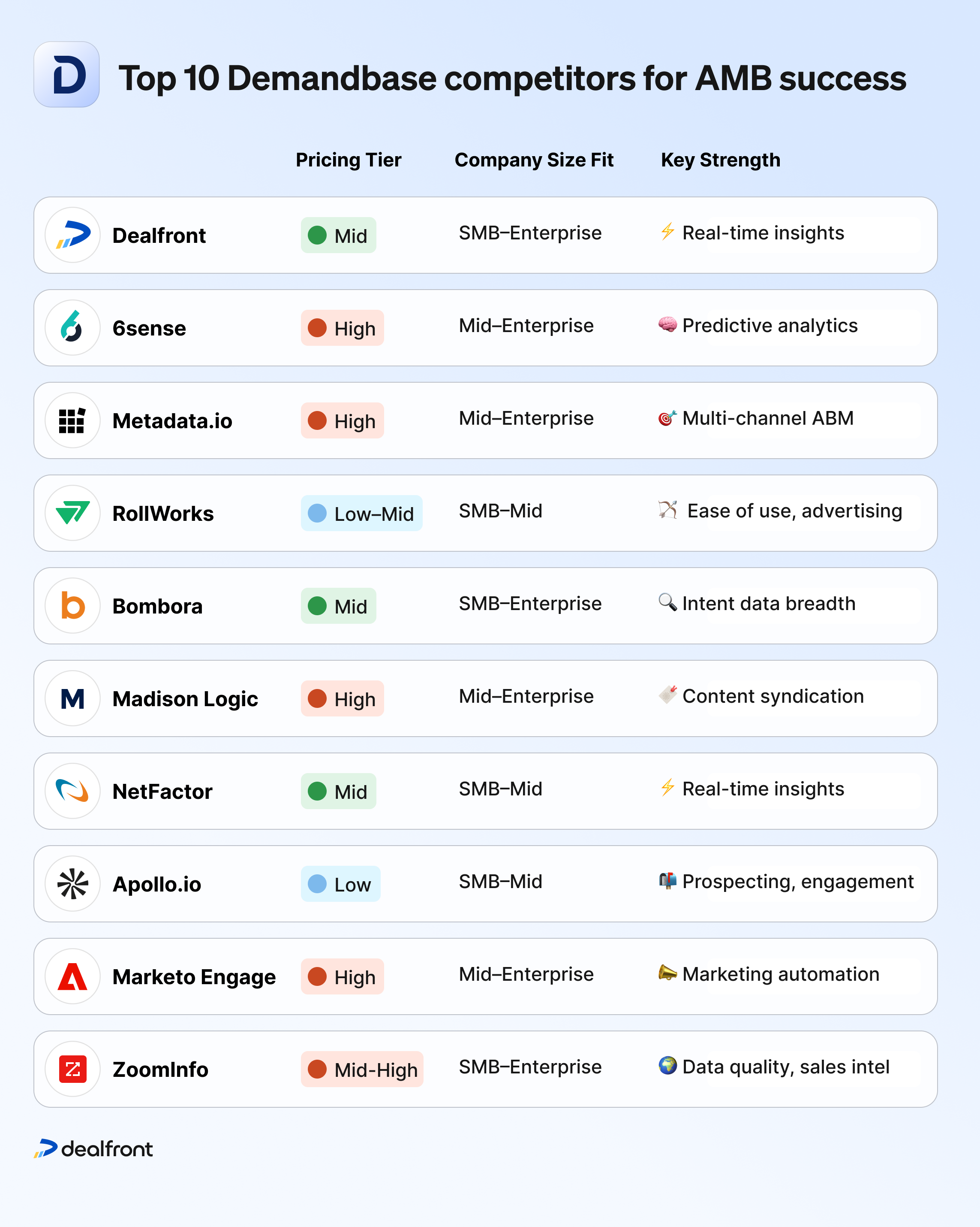 Apollo.io and RollWorks offer lower-cost plans with essential ABM features, making them attractive for budget-conscious teams. However, they may lack the depth of insight or scalability needed as your strategy matures. Dealfront offers strong value by combining intent data, visitor identification, and CRM-ready insights, without the enterprise-level price tag.