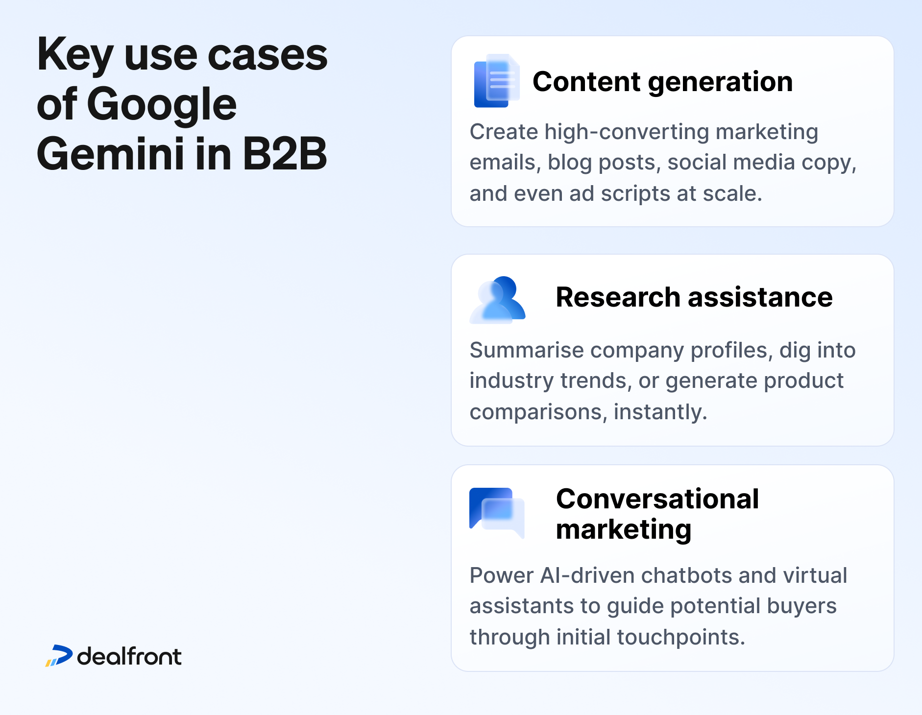 Consider Google Gemini if your needs centre around AI-powered content creation, marketing research, or internal productivity enhancements. It’s a great fit for teams with technical resources or AI expertise, particularly those looking to scale content operations or experiment with automation across their campaigns. Just bear in mind: Gemini won’t track leads or manage pipeline activities, it needs to be paired with a tool like Dealfront to complete the loop.
