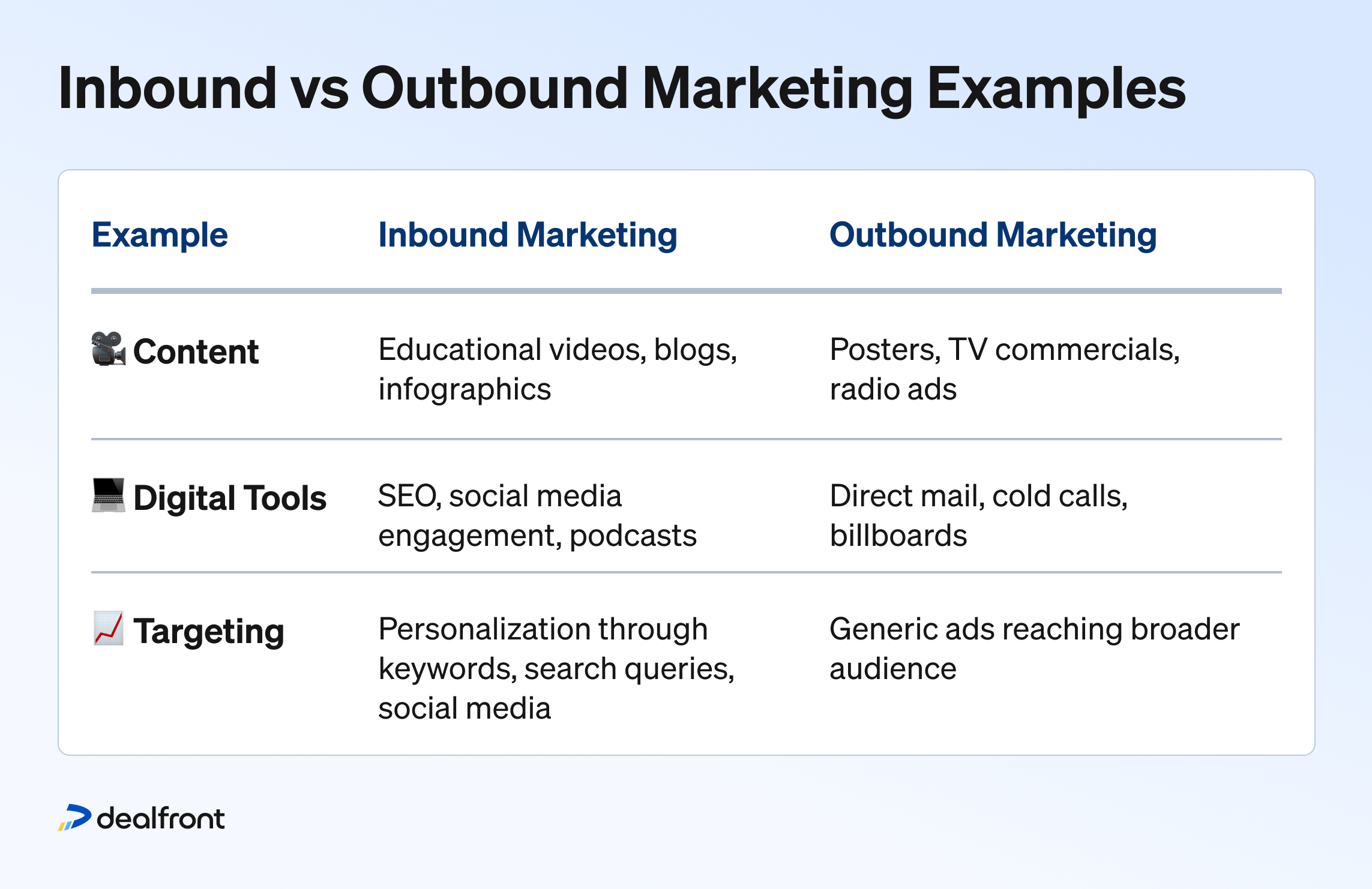 Outbound marketing: Traditional, broad-reach tactics like billboards and cold calling that aim for high visibility but are harder to track and often more costly.