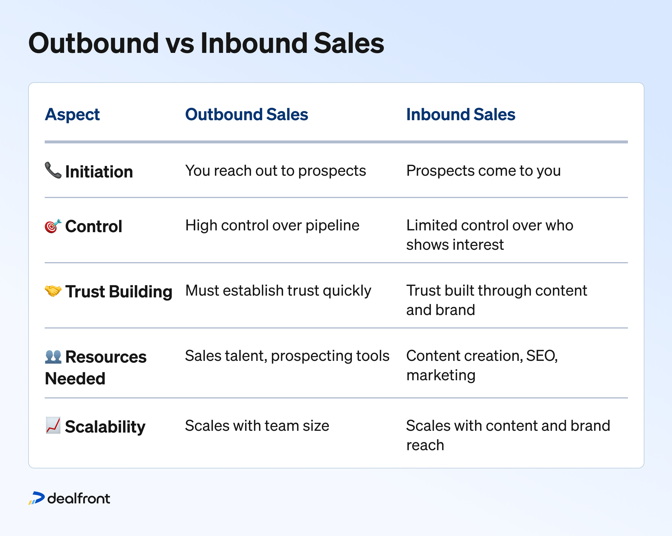 Key takeaway: Outbound sales is about ownership — you choose your targets, messaging, and timing, enabling faster market entry and direct access to decision-makers.
