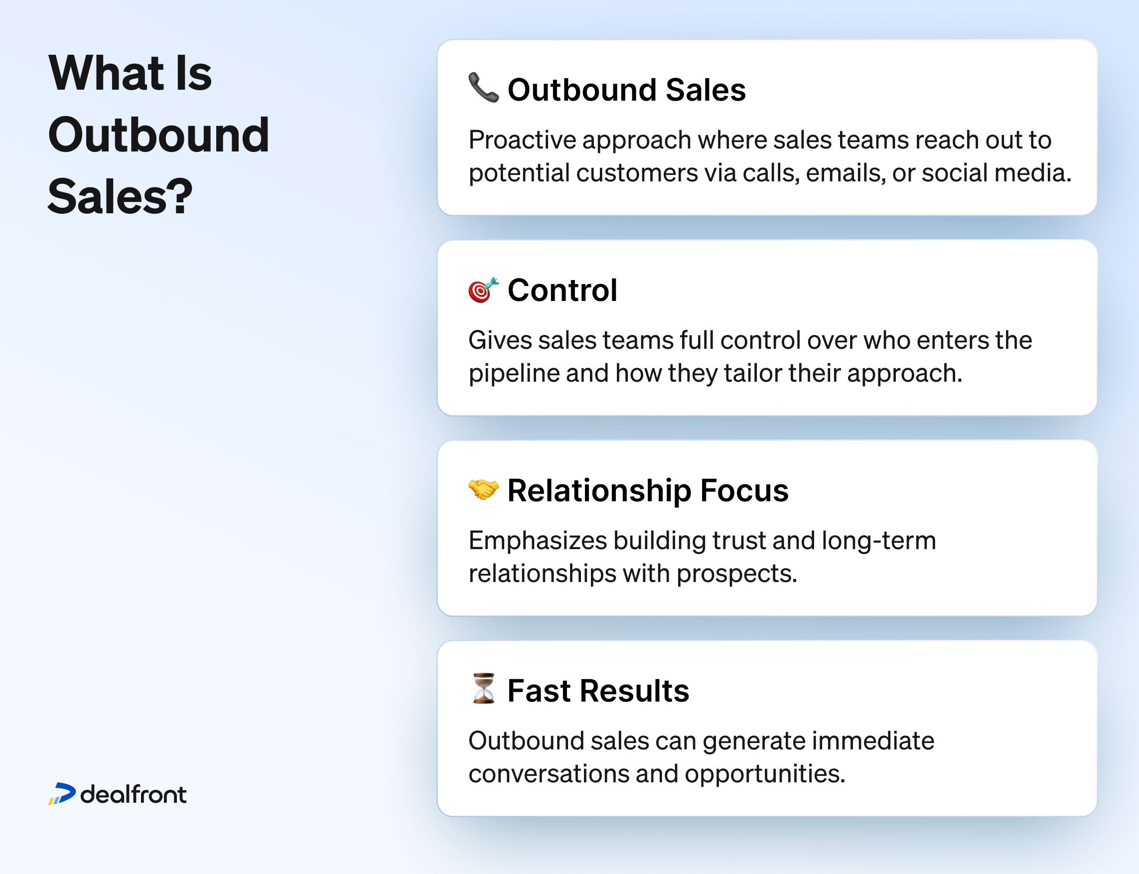 Let's define outbound sales: It's a proactive approach where your sales team initiates contact with potential customers. It involves identifying prospects who might benefit from your product or service and reaching out through calls, emails, social media, or other direct methods.