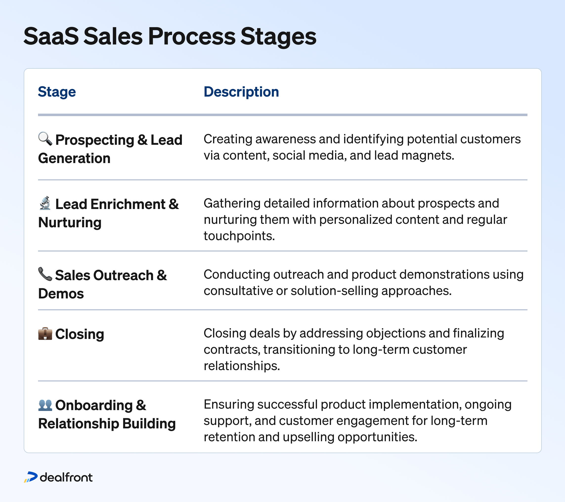 Your company and its products are as unique as its customers. Every company develops a distinct sales process. However, the main stages remain consistent across successful SaaS sales strategies. Let's examine the key stages a SaaS sales manager must oversee and coordinate: