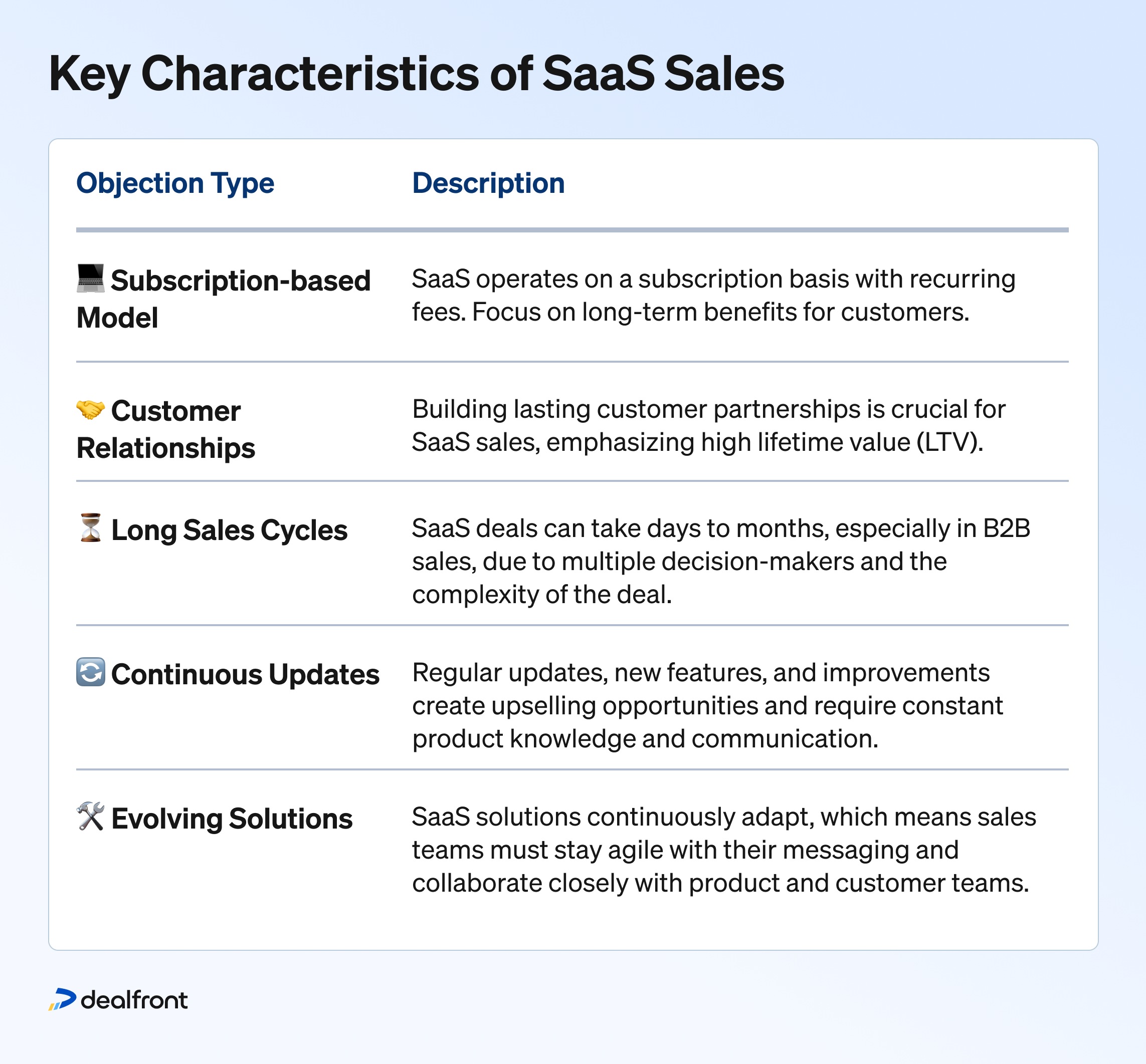 Recurring revenue model: SaaS relies on subscriptions, meaning sales teams must focus on long-term customer value and trust rather than one-time transactions.