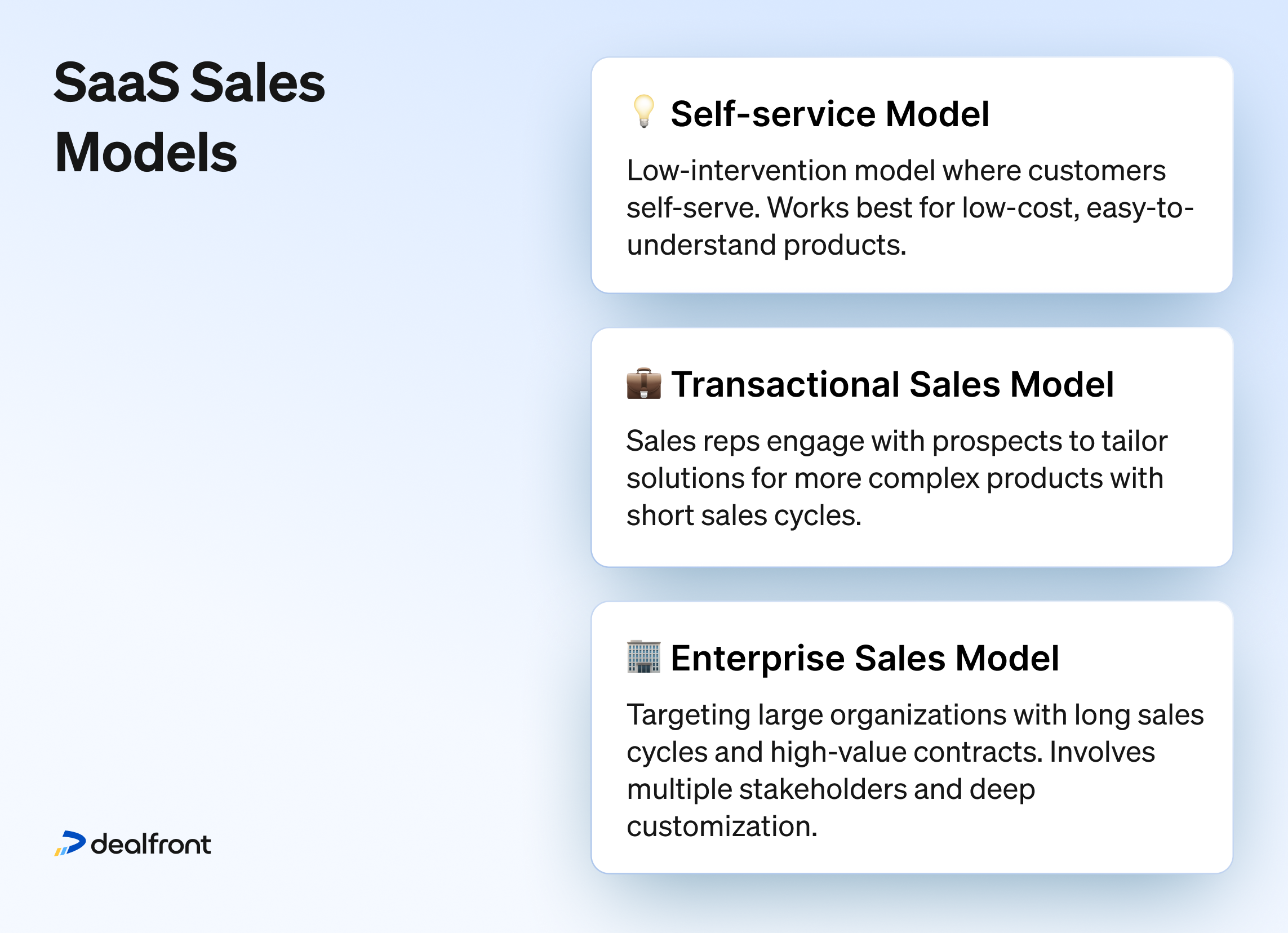 Three sales models: Self-service, transactional, and enterprise models allow flexibility in targeting different customer segments and deal sizes.