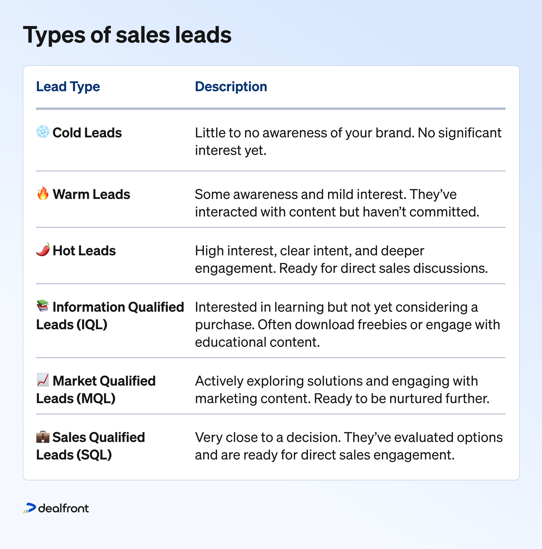 So far, we’ve covered the various types of sales leads, from cold to hot and from information-qualified to sales-qualified, exploring their journeys through the sales process.