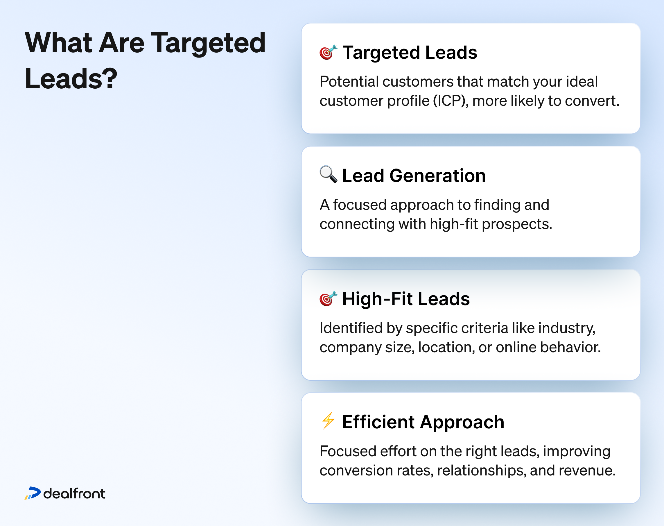Targeted leads are potential customers who closely match your ideal customer profile (ICP). These are the people or businesses most likely to need what you’re offering—and most likely to convert.