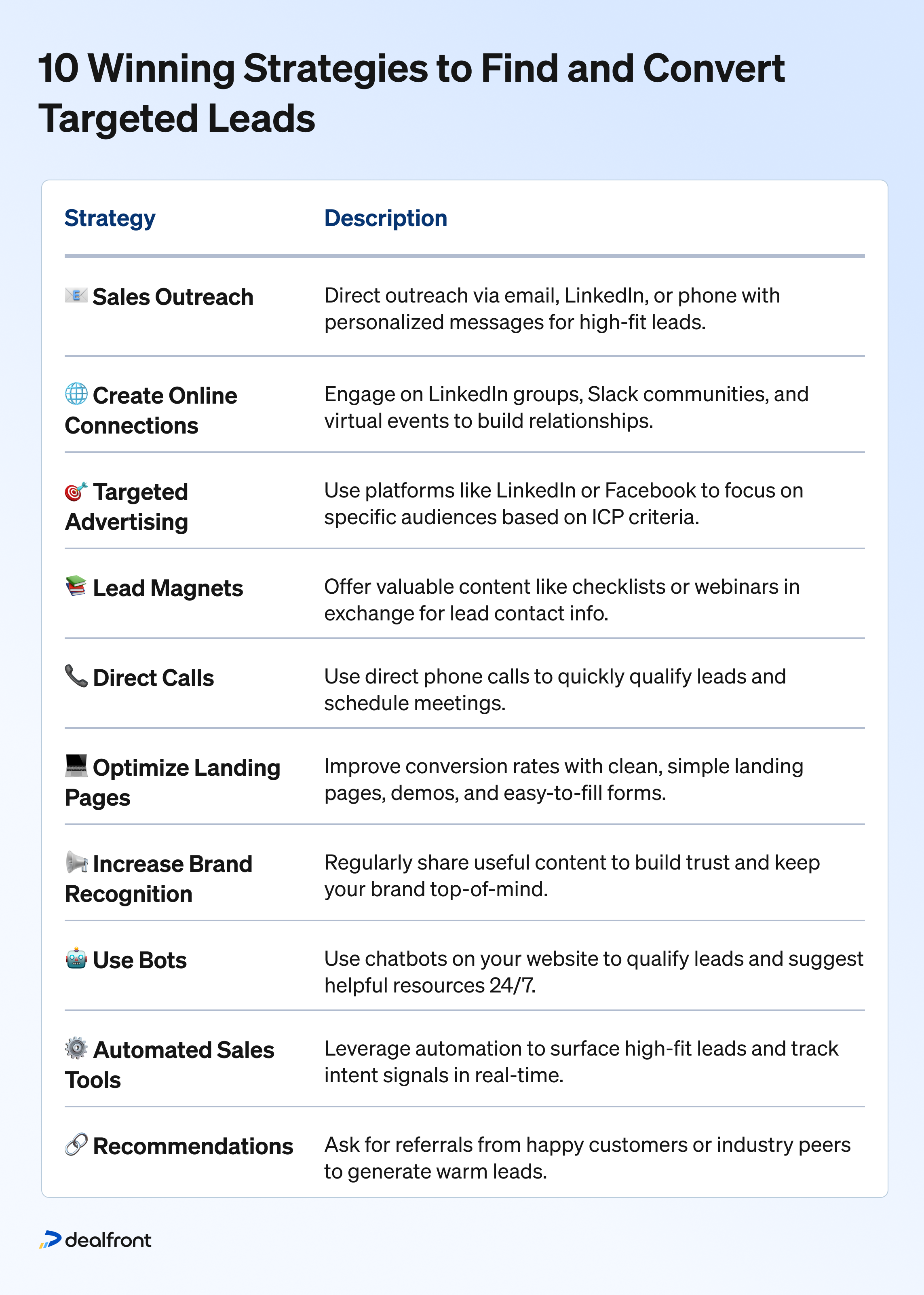 Now that you’ve got the framework, let’s talk tactics. Here are 10 proven strategies to help you find, connect with, and convert targeted leads—without wasting time chasing the wrong people: