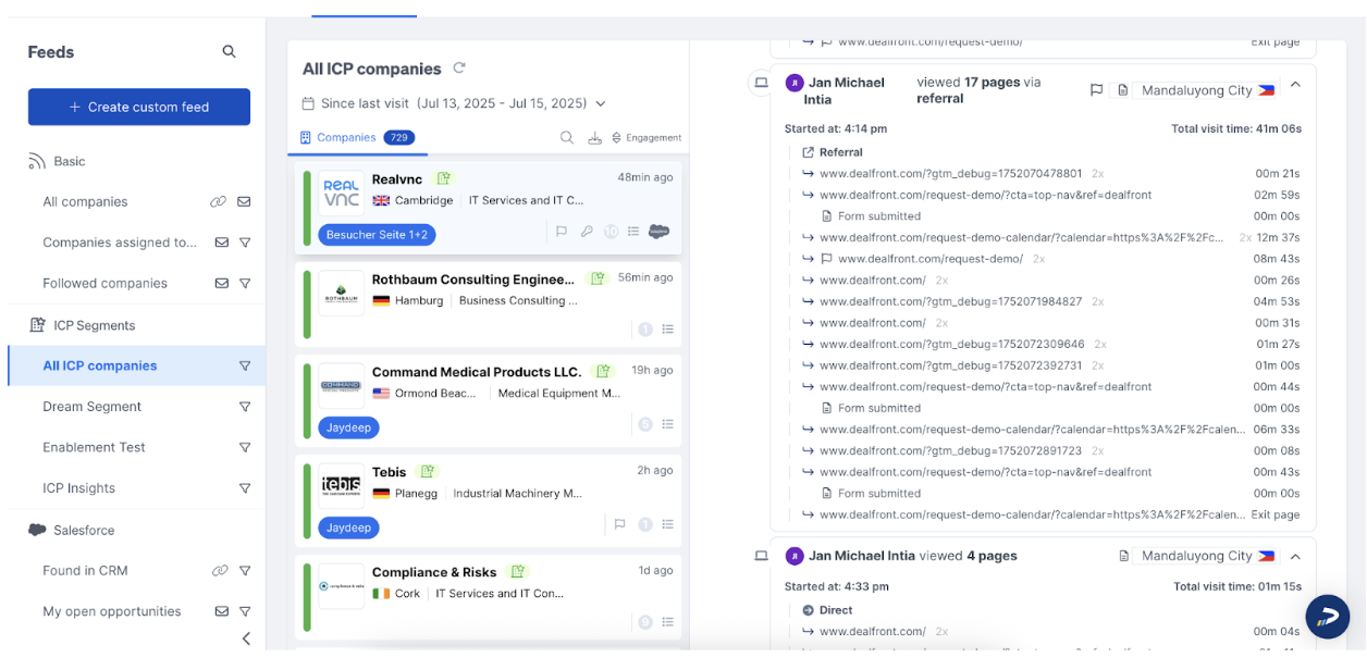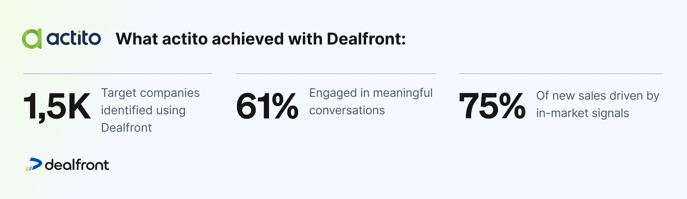 If you’ve invested in tools like Bombora, G2, or LinkedIn intent, make sure that insight is actually visible where your team works, not trapped in a dashboard that no one checks. Dealfront, for example, can surface buying signals from your key accounts directly into your CRM, helping reps prioritize the right outreach at the right time.