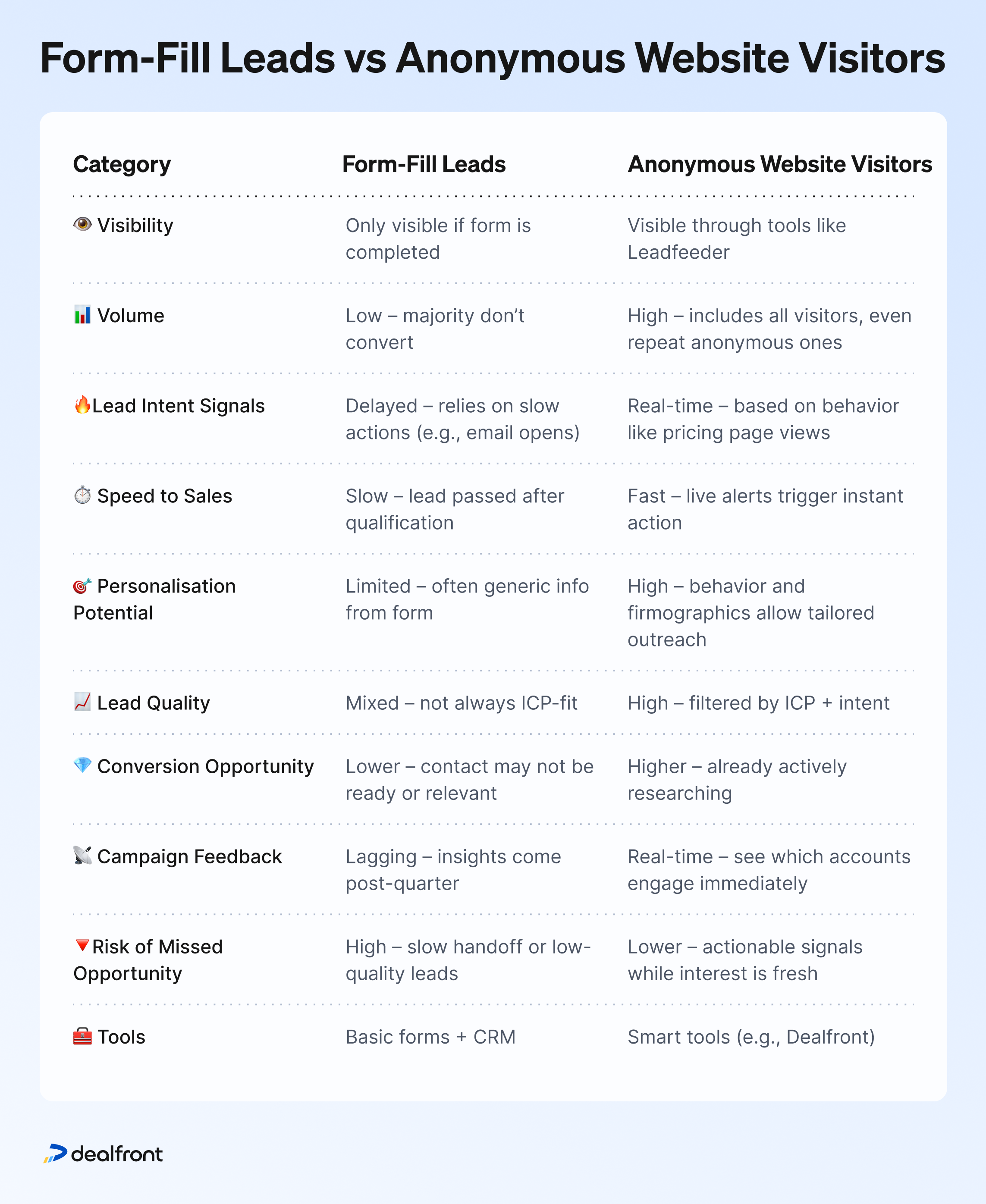 One of the main challenges though is that a lot of marketing teams don’t have the tools in place to identify these signals fast enough, if at all. But when you can deliver this information while the interest is still fresh, you’re not just handing off a lead, you’re passing on momentum. Tools like Dealfront help marketing teams monitor website activity in real time, identify anonymous visitors, and alert sales when key accounts engage, all without relying on a form fill. That means less waiting, less guesswork, and more action when it counts.