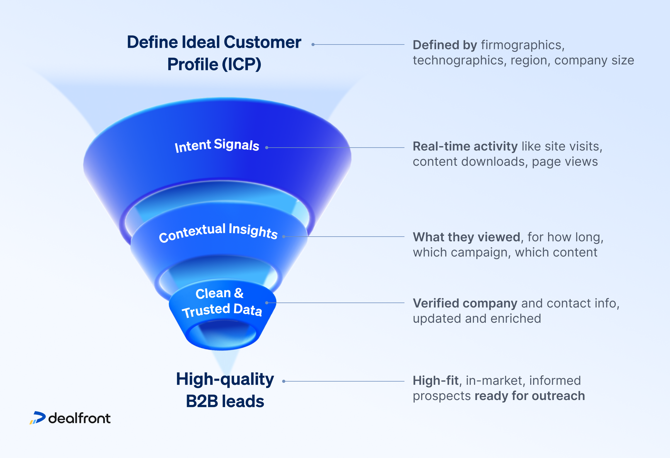 This kind of narrative, sometimes called a “lead story”, helps reps open warmer conversations, tailor their pitch, and build rapport faster. And it’s exactly what platforms like Dealfront can deliver: rich behavioural insights paired with company-level data that bring a lead to life.