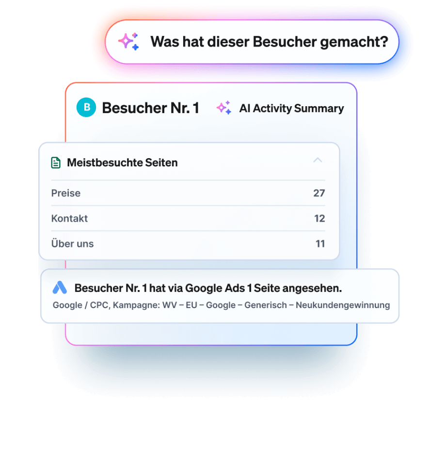 Erhalte Einblicke, wer auf Deiner Website unterwegs ist und was diese Besucher interessiert. Erfahre, wie sie Dich gefunden haben – inklusive Insights, mit denen Du sofort in die Akquise übergehen kannst.