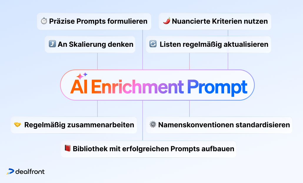 Effektive Prompts zu schreiben, entscheidet oft darüber, ob eine Anreicherung gut oder großartig wird. Viele Teams starten zu breit oder ungenau. Das führt zu generischen Ergebnissen. Die eigentliche Stärke von AI Enrichment zeigt sich dann, wenn Prompts spezifisch sind, auf dem ICP basieren und die Signale berücksichtigen, die wirklich wichtig sind. Wenn Marketing- und Vertriebsteams funktionierende Beispiele sammeln, lässt sich eine gemeinsame Prompt-Bibliothek aufbauen, die zukünftige Enrichments beschleunigt und für Konsistenz über Kampagnen und Territorien sorgt.