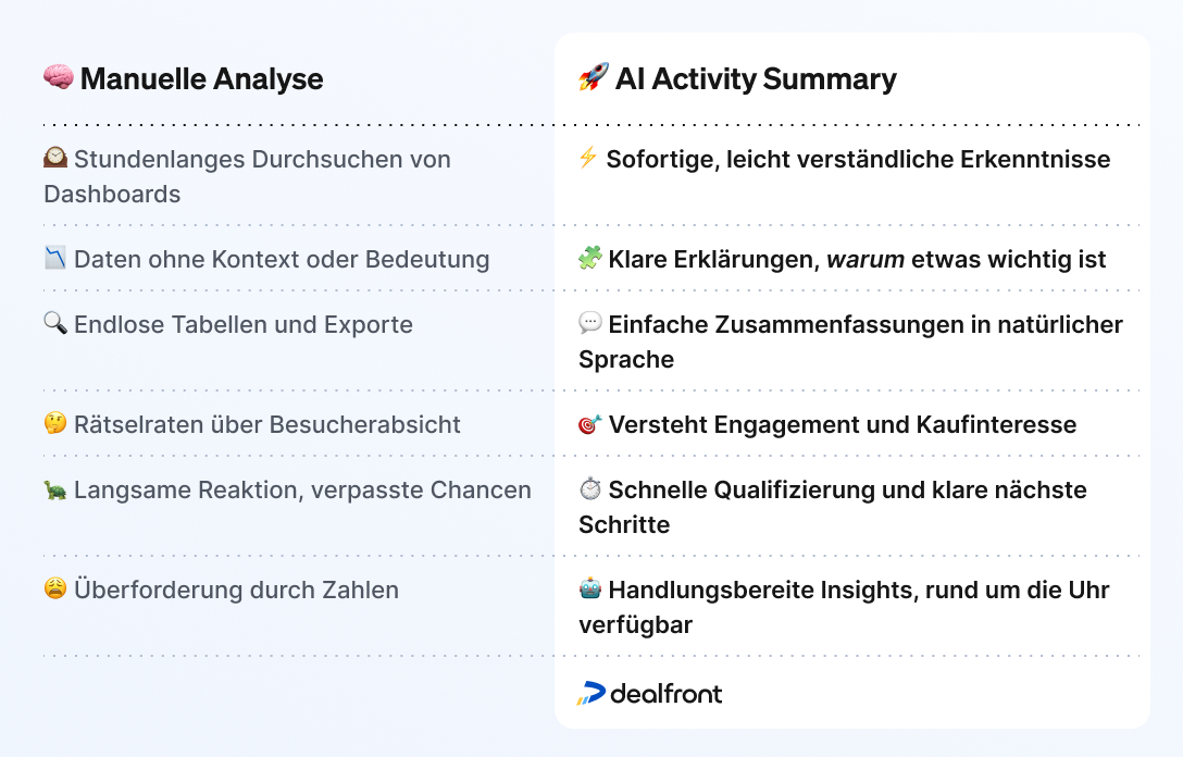 Während Dir herkömmliche Analysen zeigen, was passiert ist, erklärt Dir das AI Activity Summary, warum es relevant ist und was Du als Nächstes tun solltest. Es schließt die Lücke zwischen Daten und Entscheidungsfindung und verschafft Vertriebs- und Marketingteams sofortige Klarheit über die Absichten, das Engagement und das Potenzial der Besucher*innen.