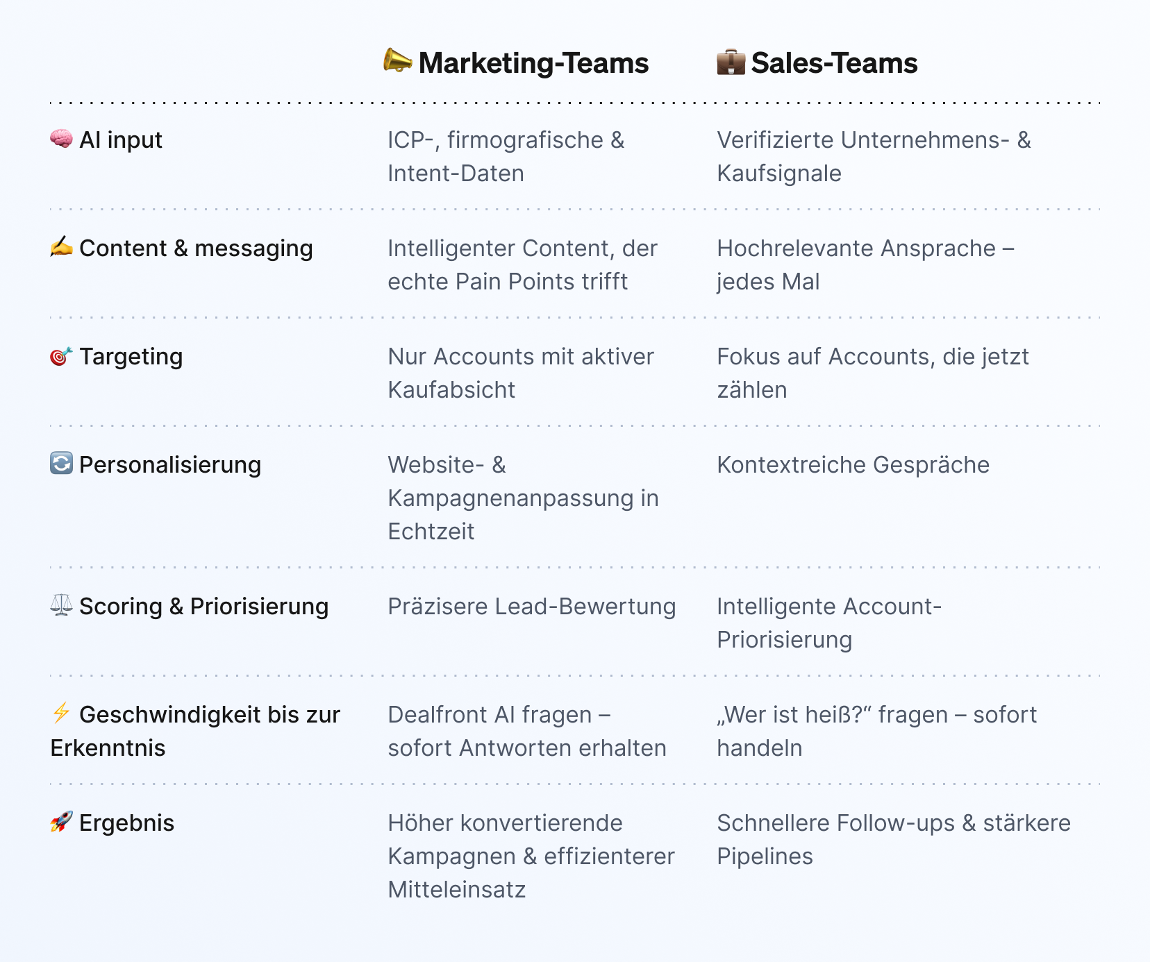 Deine KI-Tools werden leistungsfähiger, schneller und sie verstehen mit der Zeit Deinen realen Markt besser. Die verifizierten Firmen-, Intent- und Verhaltenssignale von Dealfront liefern den fehlenden Kontext, den generische KI nicht erfassen kann. Es gibt also keinen Grund mehr zum Rätselraten, denn Vorhersagemodelle erkennen, welche Accounts wahrscheinlich kaufen werden. Zudem schreiben Content Engines in der Sprache Deines ICPs – nicht in vagem Branchenjargon. Und: Personalisierungssysteme lernen, sich automatisch anzupassen und allen Besucher*innen in Echtzeit das passende Angebot, den richtigen Ton oder das richtige Thema zu präsentieren. Du erhältst also nicht nur KI, die Dinge automatisiert, sondern auch KI, die Zusammenhänge versteht.