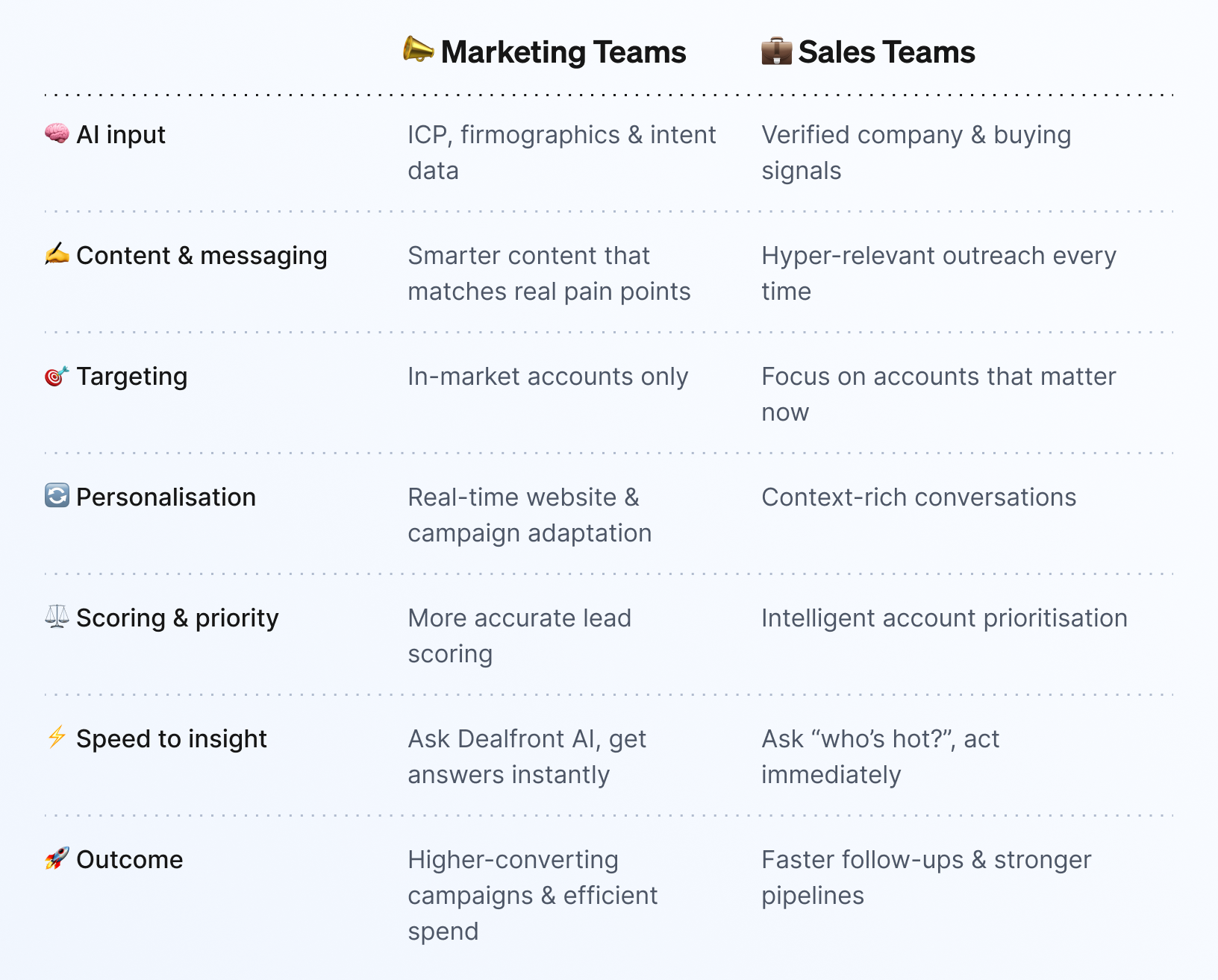With Dealfront’s AI capabilities layered over this rich data foundation, your teams can move from static data to real-time intelligence, instantly answering questions, prioritizing leads, and surfacing opportunities the moment they appear.