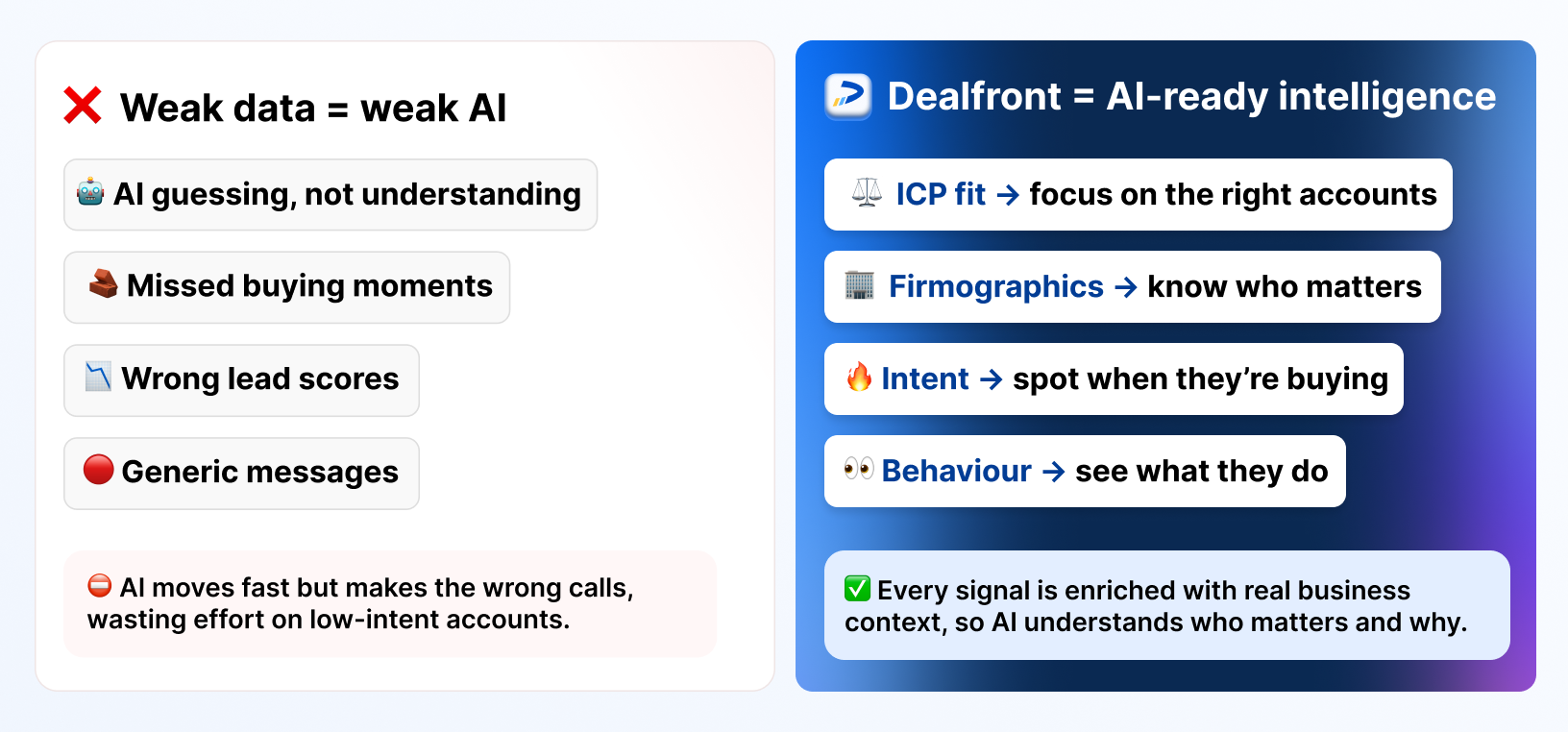 Pro tip: The richer your mix of firmographic + behavioural + intent + ICP Fit data, the more accurate your AI becomes, whether you’re building scoring models, content engines, or personalization workflows. By layering these signals, not only do you tell your AI who to target, but you also show it when they are ready and how they behave, enabling outputs that are timely, personalized, and meaningful.
