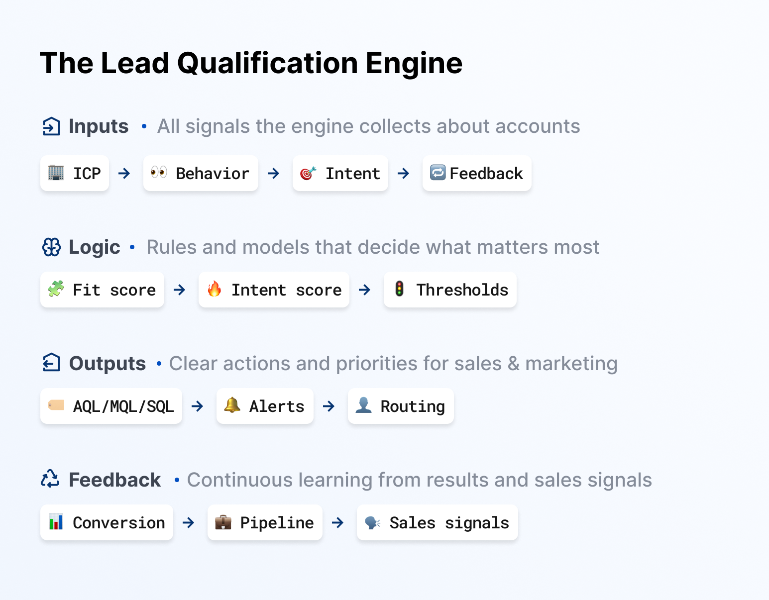 A lead qualification engine is not a one-off scoring rule or an MQL definition buried in a CRM. It’s a repeatable, data-driven system that continuously evaluates fit and intent so teams can focus on the right accounts at the right time, using real signals instead of assumptions.