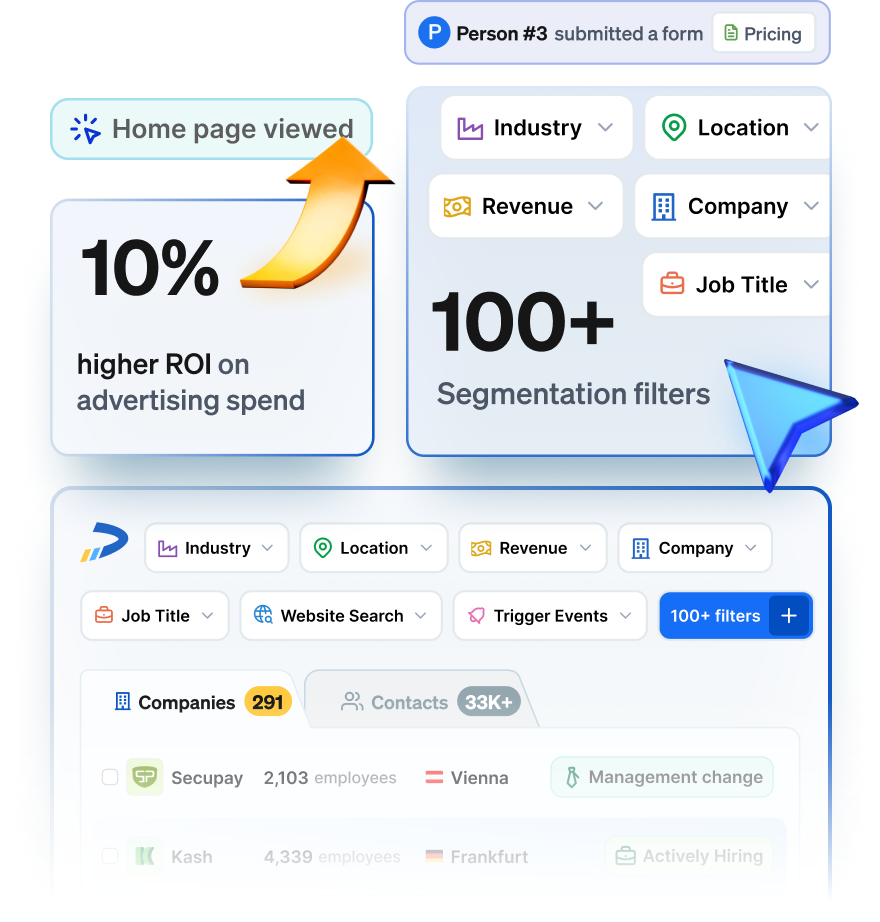 Generate more qualified pipeline without increasing your budget. Find key decision-makers at ideal-fit, high-potential companies using our comprehensive global database. Zero in on the best prospects through precise filtering of company details, technology stacks, behavior and intent signals.